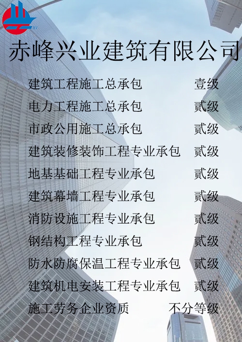 赤峰興業建筑有限公司簡介 赤峰興業建筑有限公司成立于1998年7月,位于內蒙古赤峰市松山區。現已發(fā)展成為擁有建筑工程施工總承包壹級、電力工程施工總承包貳級、市政公用工程施工總承包貳級、承裝、修、試四級、?建筑裝修裝飾工程專業承包貳級、建筑幕墻工程專業承包貳級、消防設施工程專業承包貳級、地基基礎工程專業承包貳級、鋼結構工程專業承包貳級、建筑機電工程專業承包二級、防水防腐保溫工程專業承包貳級以及建筑施工勞務等資質的綜合性建筑施工企...